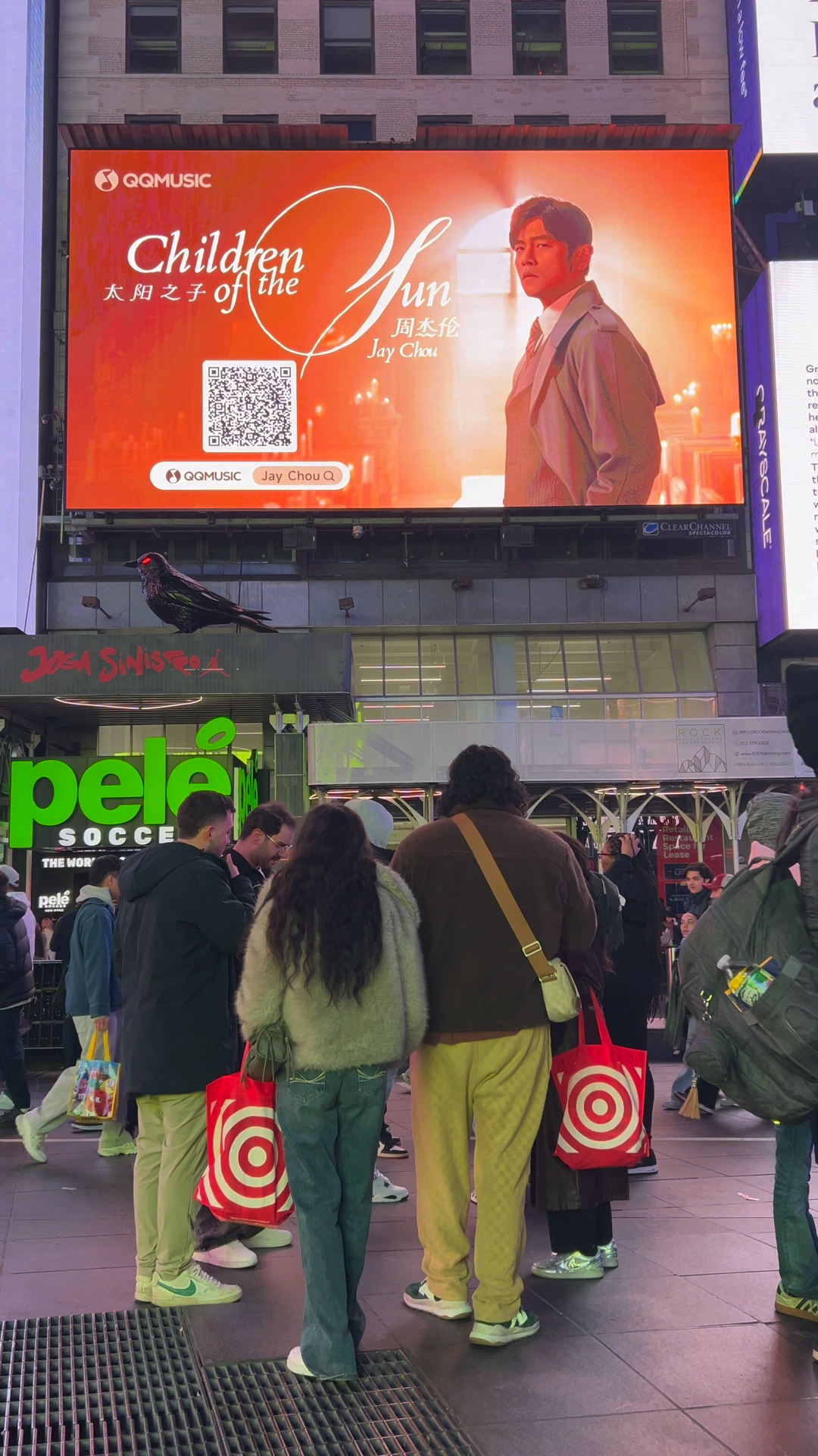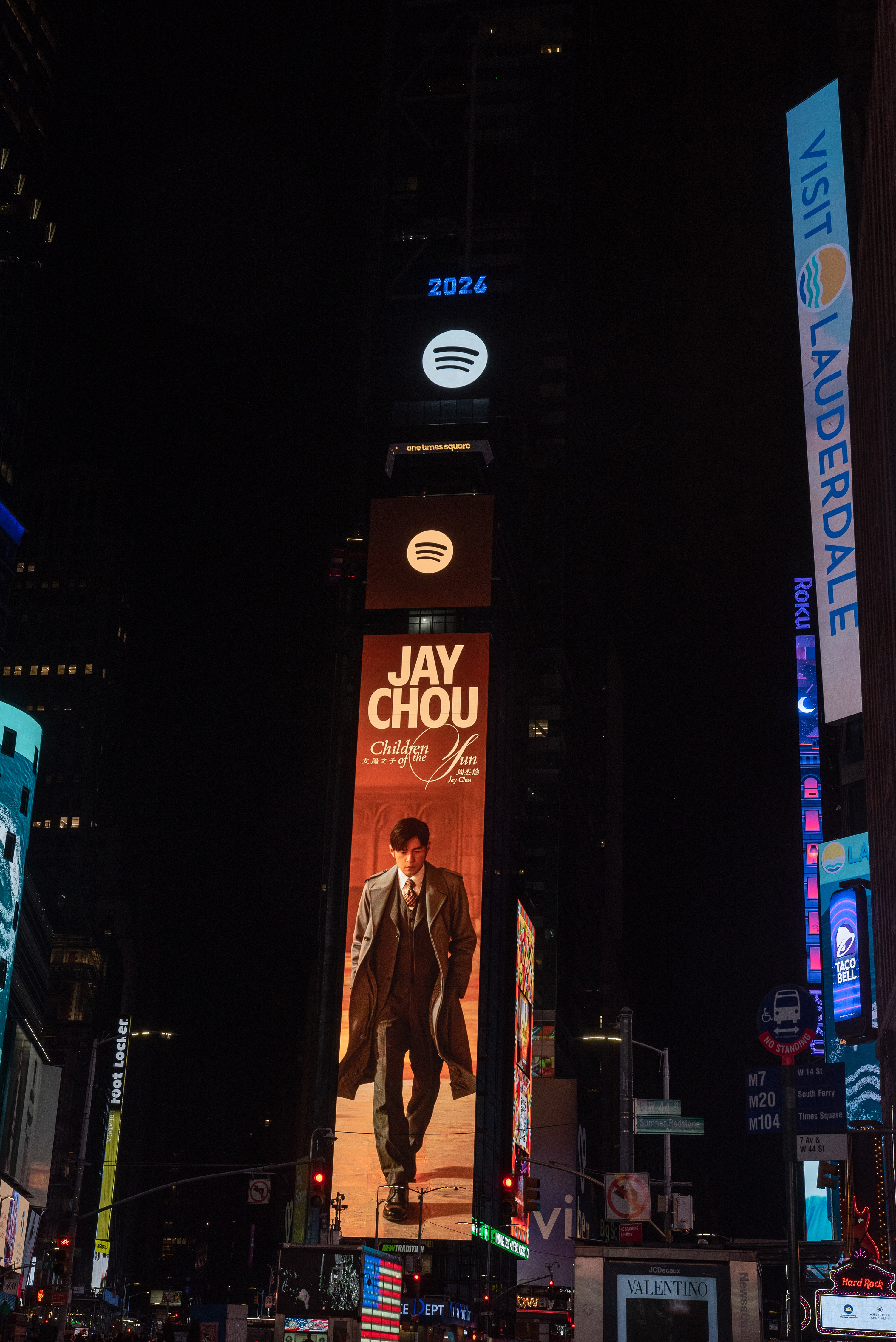 暌違近4年,樂壇天王周杰倫一推出「太陽之子」專輯就勢如破竹!除了制霸各大數位音樂平台新歌榜,數位專輯在發片短短4天不到的時間,目前銷售量突破264萬張!各大數位平台更紛紛在全球為周杰倫「太陽之子」專輯造勢,巨幕電子看板在各大城市登場,包括Spotify在紐約時代廣場Time Square 25層樓高的巨型螢幕,YouTube Music的看板也在紐約時代廣場不遠處的百老匯大道上,同時在洛杉磯落日大道、香港海港城也出現YouTube Music的看板,騰訊旗下的QQ、酷狗的看板也在紐約時代廣場露出,台北也有三個大看板在信義區,今天總計有16個巨型看板在台北、紐約、洛杉磯、香港、三亞、武漢、西安、天津、無錫登場,騰訊將陸續共有48個看板出現各大城市。特別的是,Spotify、YouTube Music、QQ、酷狗等四大平台的看板同時出現在紐約時代廣場Time Square,同步慶祝周杰倫「太陽之子」專輯的誕生!「太陽之子」耀眼紐約時代廣場!歌迷紛紛拍下耀眼的巨幕看板,周杰倫也不忘跟粉絲說:「有看到記得@我」。