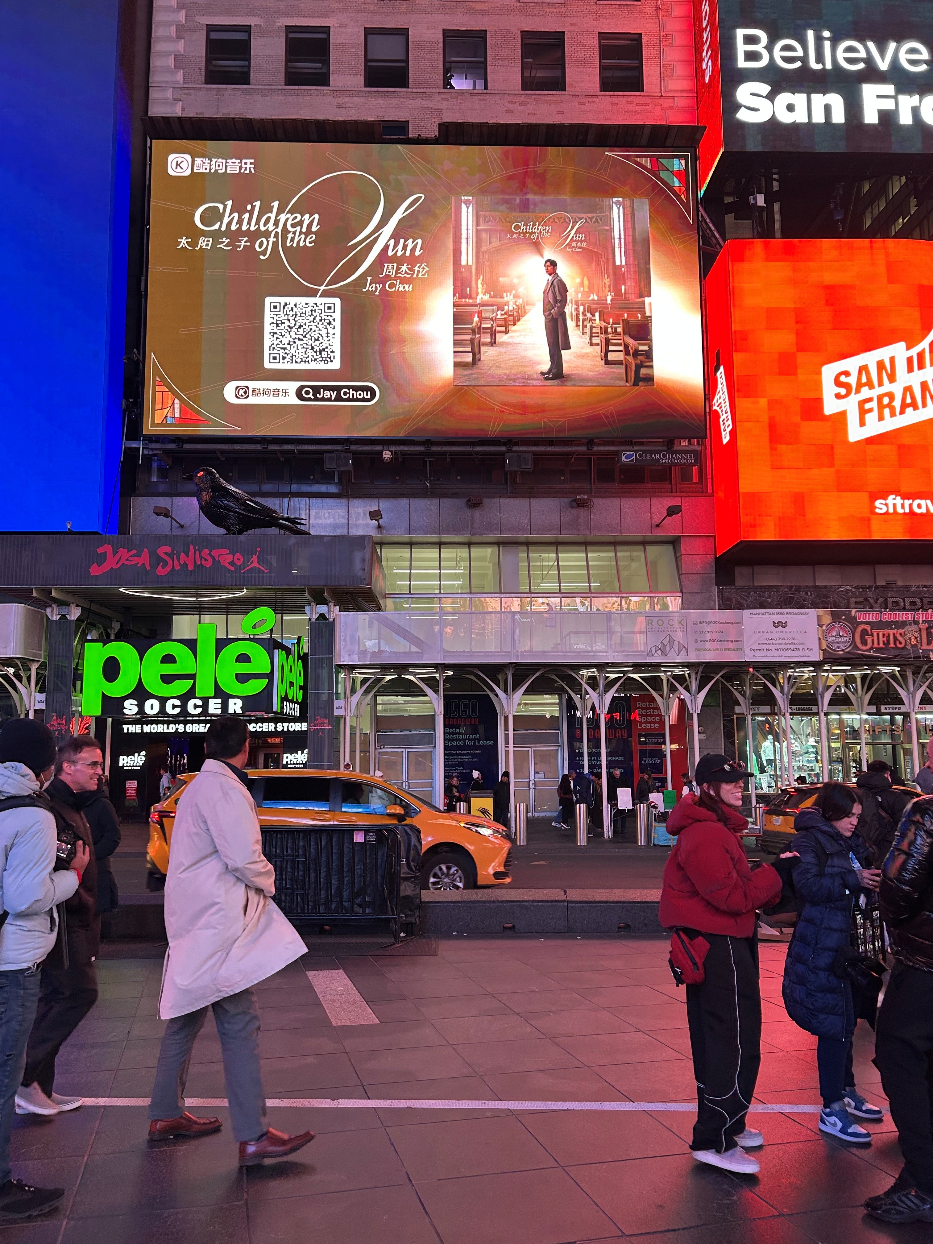 暌違近4年,樂壇天王周杰倫一推出「太陽之子」專輯就勢如破竹!除了制霸各大數位音樂平台新歌榜,數位專輯在發片短短4天不到的時間,目前銷售量突破264萬張!各大數位平台更紛紛在全球為周杰倫「太陽之子」專輯造勢,巨幕電子看板在各大城市登場,包括Spotify在紐約時代廣場Time Square 25層樓高的巨型螢幕,YouTube Music的看板也在紐約時代廣場不遠處的百老匯大道上,同時在洛杉磯落日大道、香港海港城也出現YouTube Music的看板,騰訊旗下的QQ、酷狗的看板也在紐約時代廣場露出,台北也有三個大看板在信義區,今天總計有16個巨型看板在台北、紐約、洛杉磯、香港、三亞、武漢、西安、天津、無錫登場,騰訊將陸續共有48個看板出現各大城市。特別的是,Spotify、YouTube Music、QQ、酷狗等四大平台的看板同時出現在紐約時代廣場Time Square,同步慶祝周杰倫「太陽之子」專輯的誕生!「太陽之子」耀眼紐約時代廣場!歌迷紛紛拍下耀眼的巨幕看板,周杰倫也不忘跟粉絲說:「有看到記得@我」。